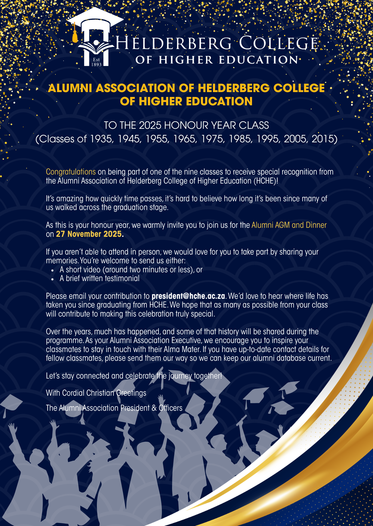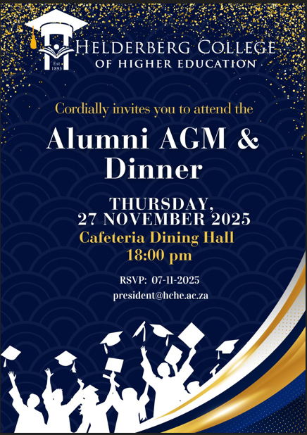 Get ready to reconnect and shape the future! We’re excited to announce that the annual general meeting for the Helderberg College of Higher Education Alumni Association Name will be held soon.